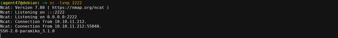 Paramiko is a popular python library for doing SSH operations, so I setup a fake SSH server. This time, we captured some creds;