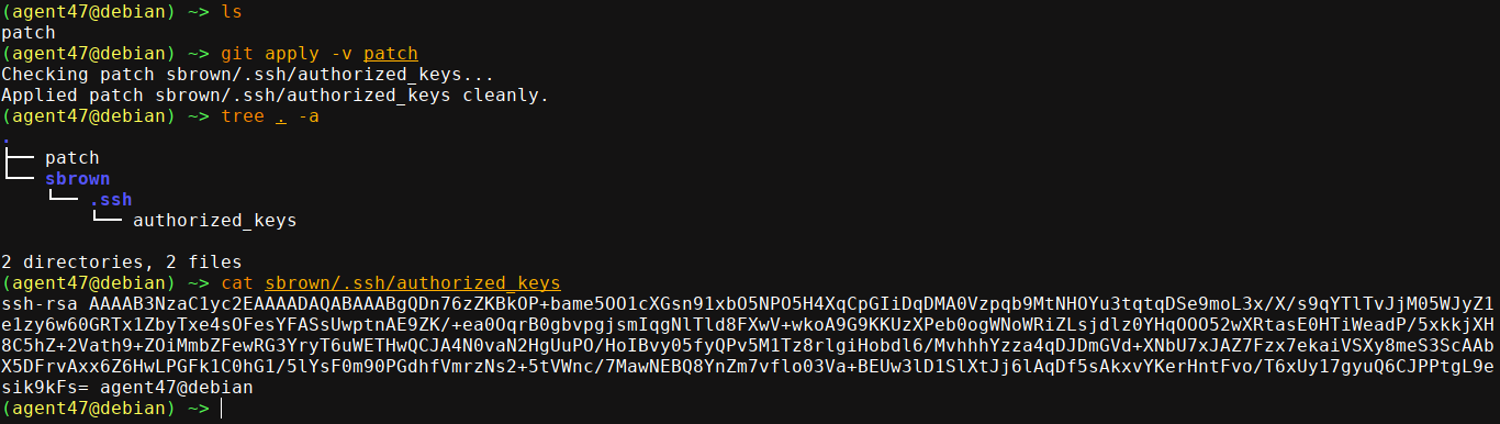 git apply is a command used to apply git patches, which are generated using git diff. After some local tests, I was able to craft a path file that could add an SSH key to .ssh/authorized_keys in sbrown’s home dir;