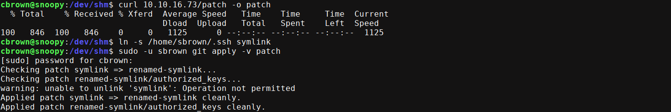 I uploaded it to /dev/shm/patch and created a symlink to /home/sbrown/.ssh as symlink;