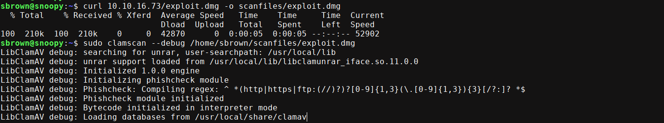 User sbrown has sudo permissions to run clamscan, which is the utility for ClamAV for running virus scan on the filesystem. Searching for known vulnerabilities lead me to this blog, which mentioned CVE-2023-20052. Using this PoC, I was able to generate a .dmg file that loads /root/.ssh/id_rsa, which gave me the root SSH key;