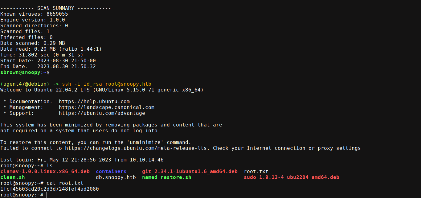sbrown;- Exploited ClamAV (CVE-2023-20052) to leak root SSH key.
