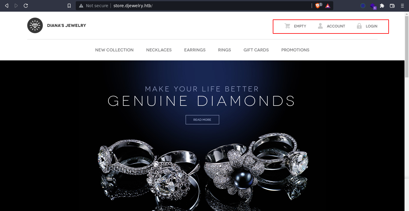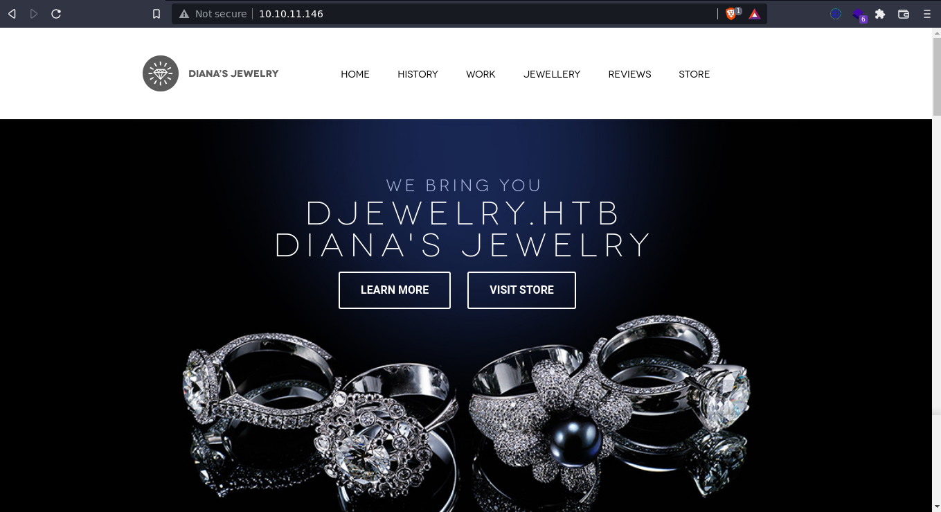 The page showed a hostname djewelry.htb, so I added it to my hosts file. The store link points to store.djewelry.htb.