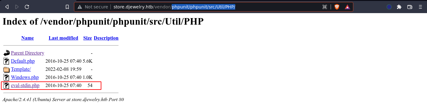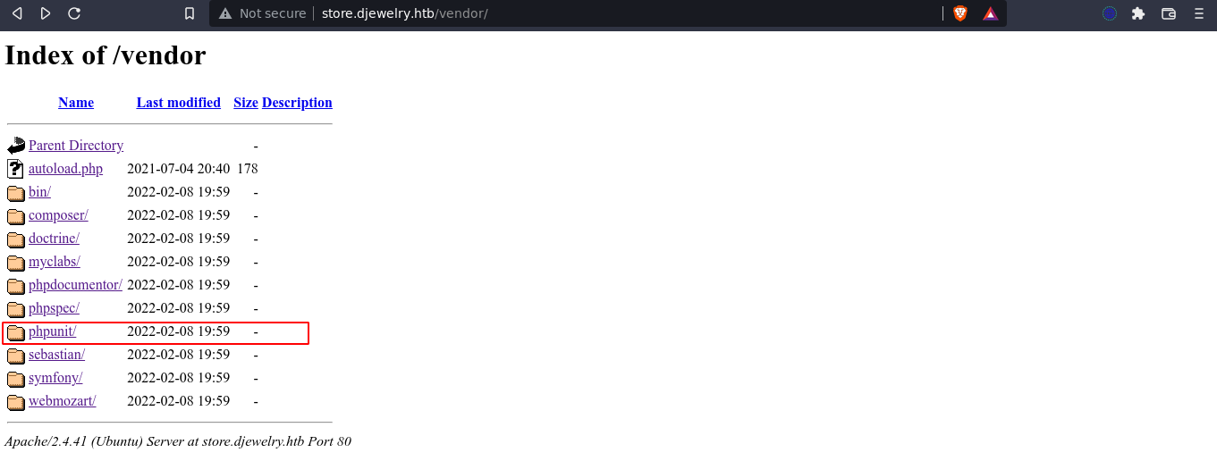 Fuzzing for subdomains using ffuf didn’t yield anything new. However, fuzzing the web root of store.djewelry.htb found a directory that contains PHP libraries;