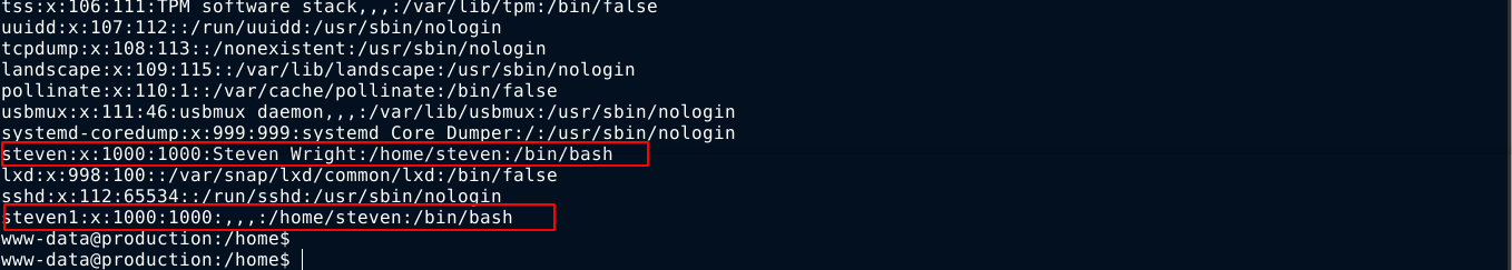 A local user named steven exists on the box. The /etc/passwd file showed something weird;