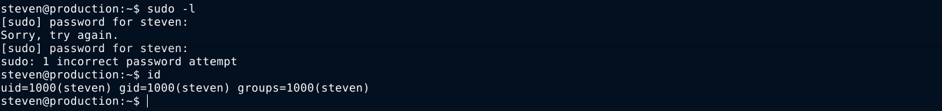 Attempts to view sudo permissions kept failing due to authentication failures. I am guessing this is because although we supplied the username and password of steven1, we were logged in as steven;