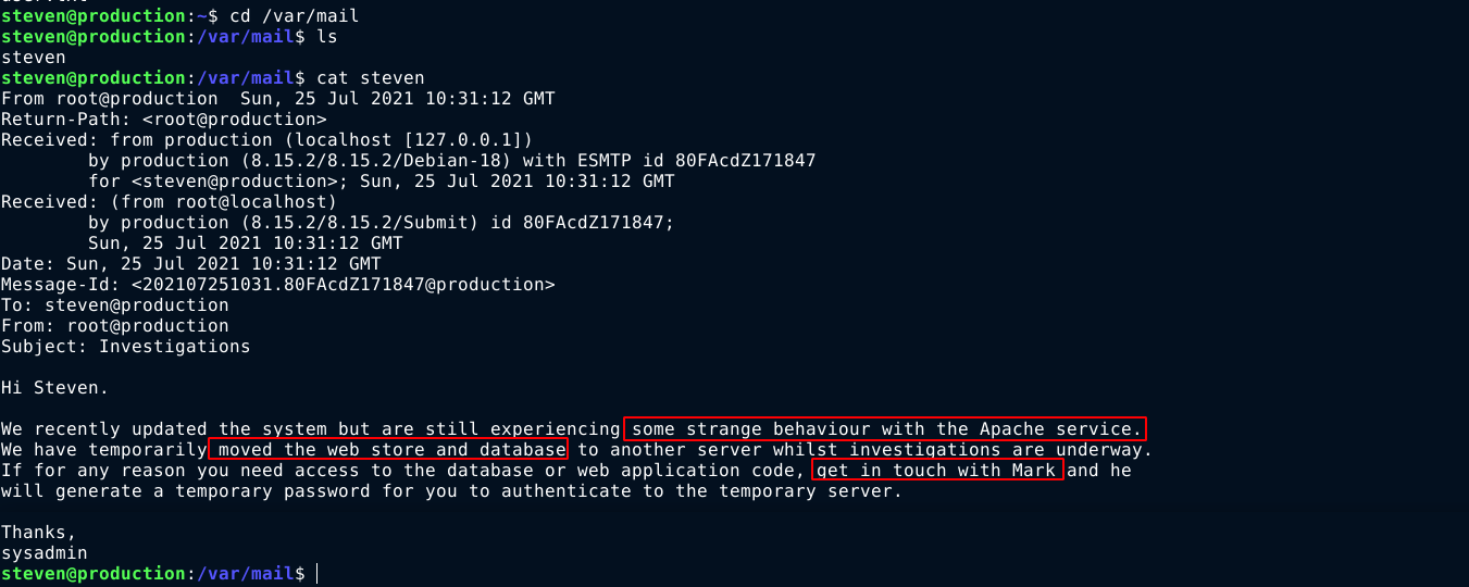 Looking through the filesystem, I found an interesting email for steven;