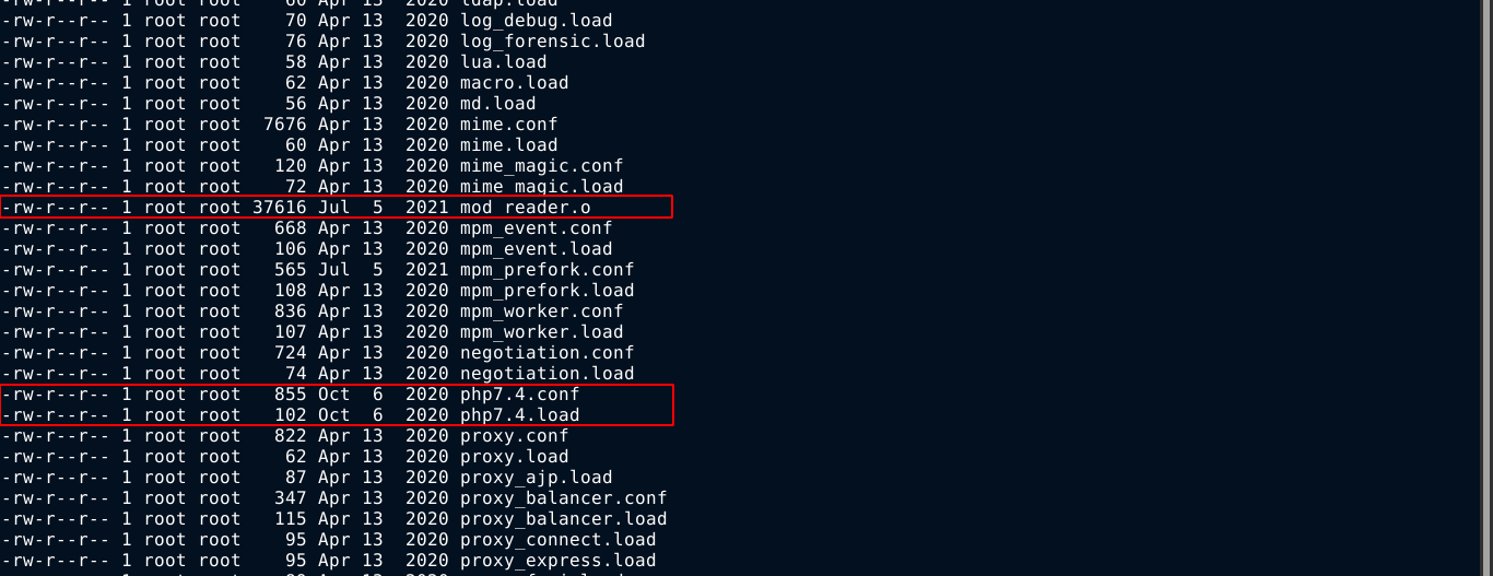 A few files in /etc/apache2/mods-available stood out based on their modification timestamp;
