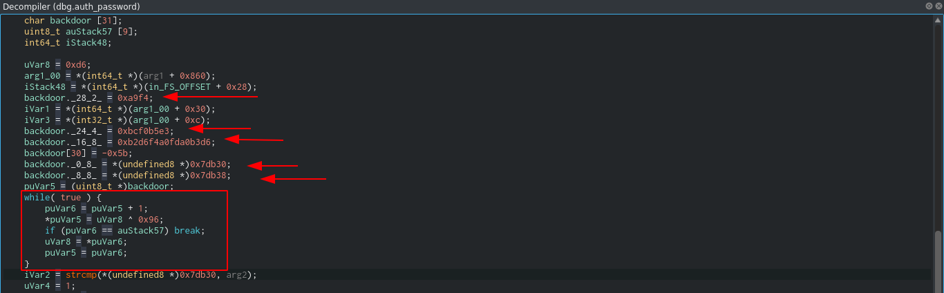 The binary has A LOT of strings, and going through them for possible keys or passwords didn’t yield anything. Looking at the function that handles authentication, auth_password, I found something interesting;