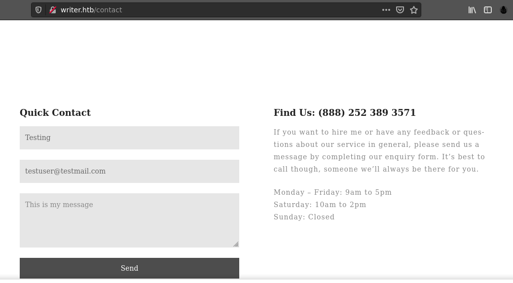 The contact us page has a form that appears to be non-responsive at first, but looking at my proxy, a request was actually made that returned a 404 Not found;