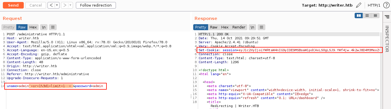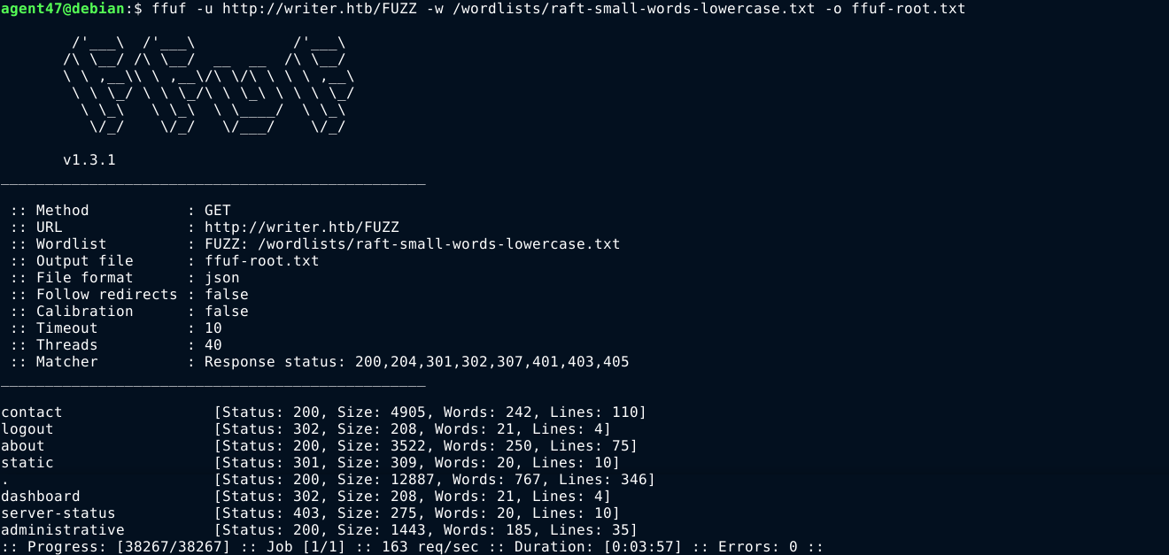 The login form at /administrative page is submitted via POST request with the parameters uname and password. Changing the request method to GET does not appear to affect the way the web app process the form. Deleting the password parameter raised a 500 INTERNAL SERVER ERROR, but deleting the uname parameter didn’t display any error. This indicate a difference in the way the two parameters are handled by the web application. Attempts to bruteforce the login page using the discovered email address admin@writer.htb, the username admin, and a wordlist made by crawling the web pages using CeWL didn’t work.