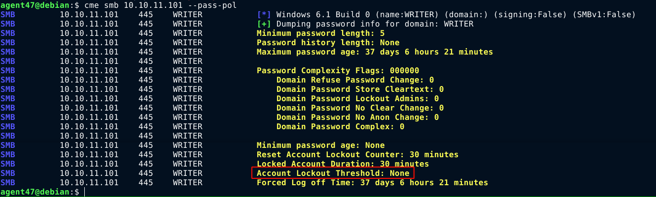 Dumping the password policy of the SMB server using CrackMapExec, the server does not have any auto-locking policy for accounts, which means we can bruteforce creds with locking accounts;