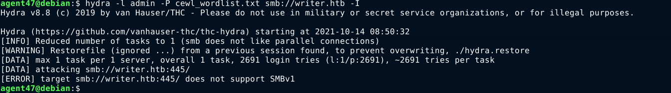 I’m guessing the error is due to lack of SMBv1 support, which is what hydra reported also;