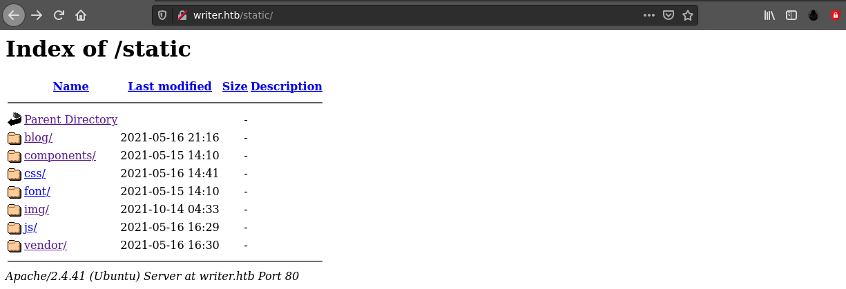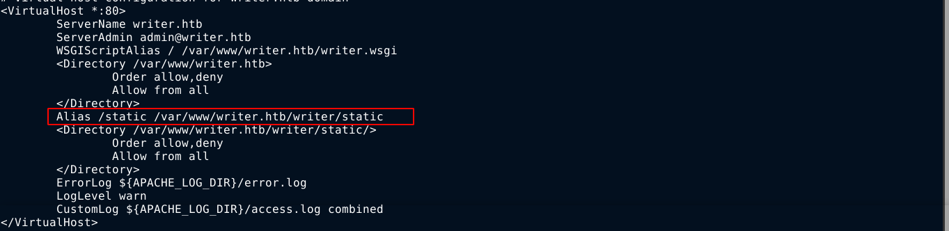 I needed to view the source code to understand what’s going on. The contents of the apache2 config file for enabled sites/vhosts showed /static path in the web app was mapped to /var/www/writer.htb/writer/static;