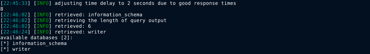 After exporting the login request from Burp Suite, I passed it to sqlmap with the --threads=10 to speed things up a bit since it’s a blind SQL injection. It identified 2 databases in the server; information_schema, which is default for MySQL servers, and writer;
