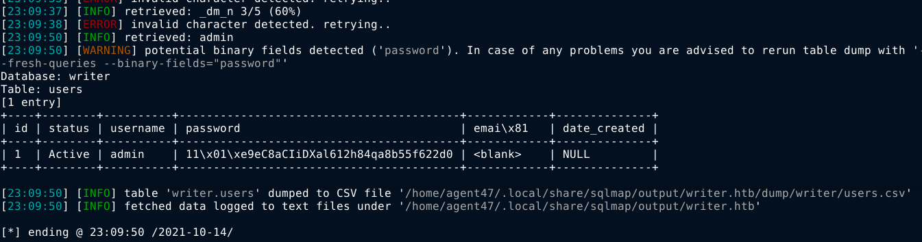 After sqlmap screemed at me all the way about invalid characters, the table users was dumped successfully, which was found to contain hash of the user admin;