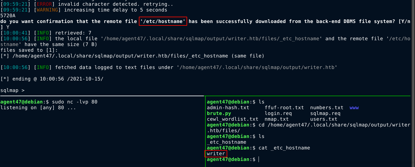 Going back to the SQL injection using sqlmap, I realized I may be able to read local files using the --file-read argument. So I tested it by requesting /etc/hostname, and it worked. Since it’s a blind injection, the retrieval was slow and will be slower when dealing with larger files;