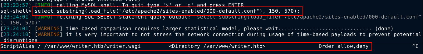And just like that, web root has been identified. The .wsgi is for python web applications, which explains some the difficulties I had enumerating paths earlier. Uploading a .php and a .txt files to the above path didn’t show any error message, but the uploaded files could not be requested. By checking the size of the uploaded files using the length(load_file('/path/to/file')), I verified the upload was successful. This is most likely a deadend because all requests to the path are being handled by the writer.wsgi script, and even if I managed to overwrite it, I will need to reboot the Apache server for the script to be loaded again. So I went back to all my previous findings in hope of finding something I missed earlier.