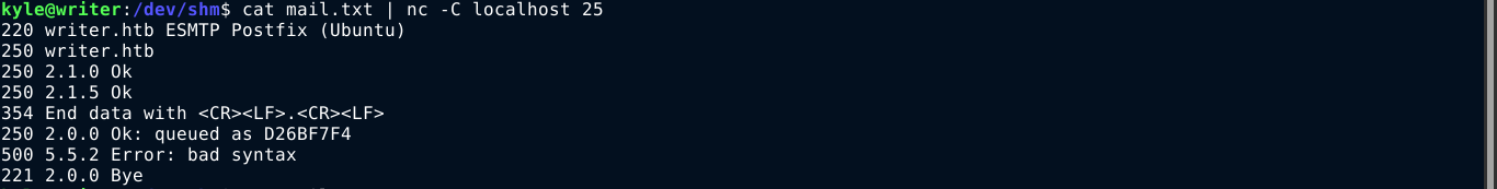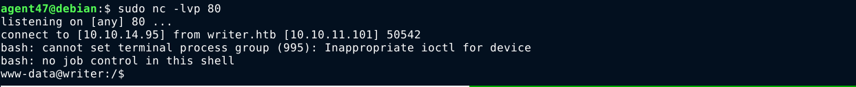 This means all I need to do is inject a reverse shell in the disclaimer file, and send a message to any of the listed email addresses to gain code execution. Using nano and netcat, I was able to achieve this after a few tries as the box is restoring the contents of the disclaimer file frequently;