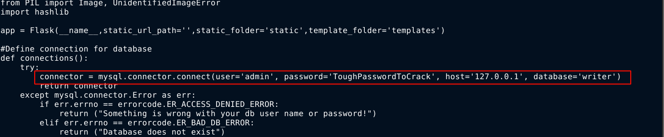 Going through the source file of the web application, I found a MySQL credential for the web app;