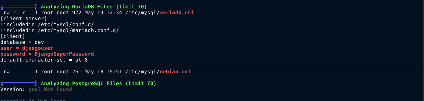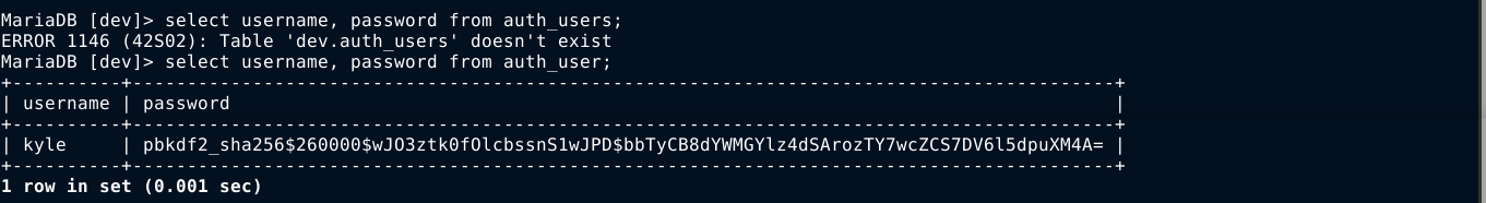 - Found and cracked a hash for kyle in the backend MySQL database used by Django.
