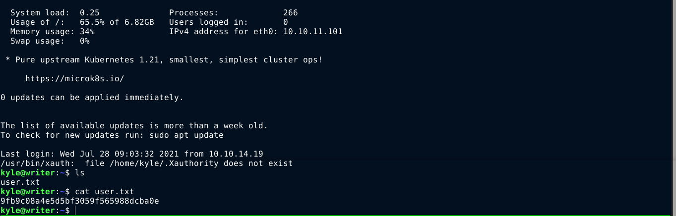 Two local users were identified: john and kyle. Kyle got the user flag.
