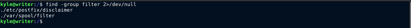 User kyle does not have sudo access on the host. However, he is a member of smbgroup, and filter. Attempting to access the SMB service using his credentials failed. Searching the filesystem for files with group smbgroup and filter, I found an interesting match for the filter group;