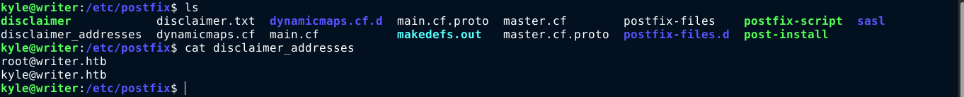 The file /etc/postfix/disclaimer looks interesting, and I have write permission to it. I had to do a bit of reading online to know what it’s used for. I found out that for any email in /etc/postfix/disclaimer_addresses that send or receive mail, the file /etc/postfix/disclaimer will be executed. There are two (2) emails in the disclaimer_addresses file;