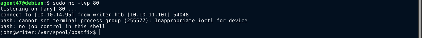filtergroup, and have write permission on the file/etc/postfix/disclaimer, which get executed when sending/receiving emails to/from certain addresses. - Injected a reverse shell into the file, and gained access to the box as the user john
