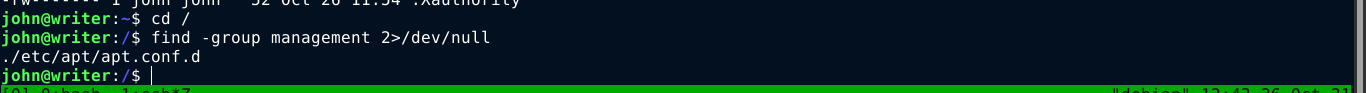 I can’t list sudo permissions for this user as I still do not have his password. The user belongs to the group management. Searching for files belonging to the group, I got only one hit;