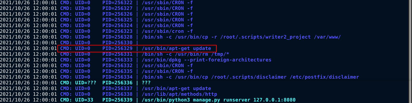 Checking the outputs of pspy, I noticed a possible cron job that’s running apt-get update;