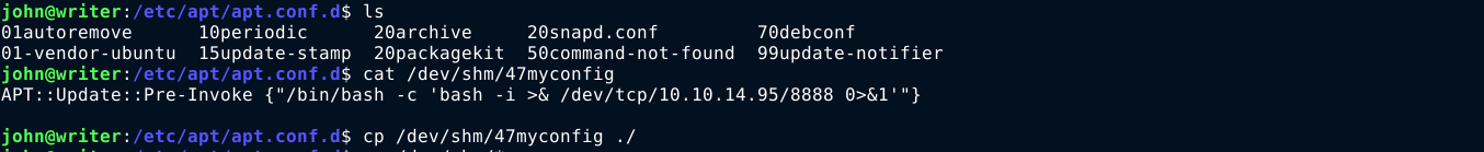 /etc/apt/apt.conf.dthat execute a reverse shell command whenapt-get updatewas invoked, and gained access to the box as root.