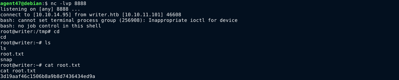 I then setup a listener, and wait for the update command to be executed by the cron task. It worked, and I got a reverse shell as root;