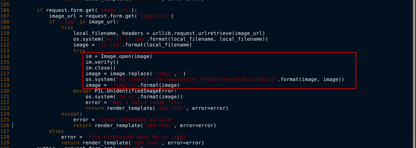 Since /static is accessible in the web root of the website, that means /var/www/writer.htb/writer will likely be the root of the website. Reading up a bit on how python web apps handle paths, I learned that the file __init__.py is usually used to handle the path mappings of a directory. So I used SQLMap to dump the file, which will be at /var/www/writer.htb/writer/__init__.py in this case, and I got the python source code. Going through it, I found a possible command injection flaw on how the web app handles URL uploads when adding a story in the admin dashboard;