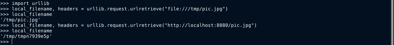The urlib.request.urlretrieve method returns two values, the path to which the given URL has been downloaded, which will be random name inside /tmp, and the headers returned. Notice that the the local_filename is injected directly into a system command used to move the image. Testing the urlretreive() function locally showed that it supports the file:// protocol, and that the returned local_filename when using the file:// protocol is not random, but the absolute path of the file on disk.