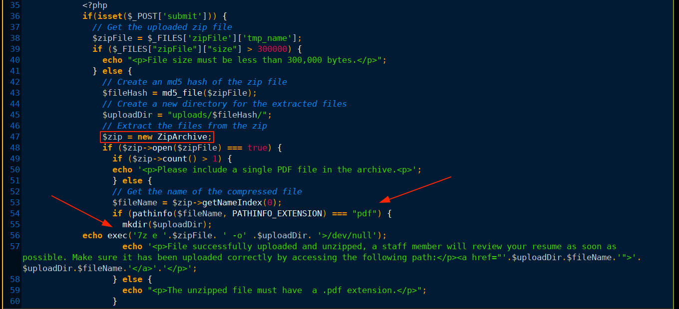 As you can see above, the web app uses ZiprArchive to run some checks on the binary prior to extraction. The open() command loads the archive, which will help detect invalid zip files. The script then calls getNameIndex(0) to obtain the embedded file name of the compressed file. If this ends with .pdf, the program proceeds to call 7z to extract the archive to the uploads/<file-hash>/ directory.