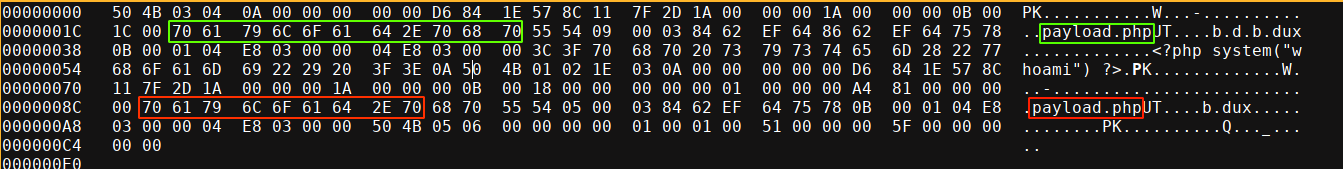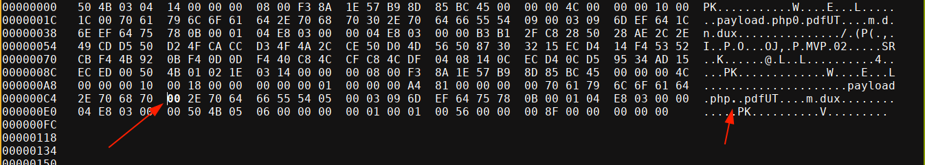 The name highlighted red above is the central name. I started playing with this in a hex editor, and I realized that 7z and ZipArchive work very differently where null bytes are concerned: ZipArchive DOES NOT stop reading a central filename when it encounters a null byte in it, it simply replaces it with a whitespace. 7z on the other hand simply stops reading the filename when a null byte is encountered. This is interesting because ZipArchive is what the web app uses to validate the file extension of embedded files. So if we are to add a null byte to the central name just after .php extension but before .pdf, ZipArchive will read the complete filename and therefore see it as a .pdf file, while 7z will truncate it after the null byte, and see it as a .php file. Since 7z is what handles the actual file extraction, this will lead to a .php file being created on disk.