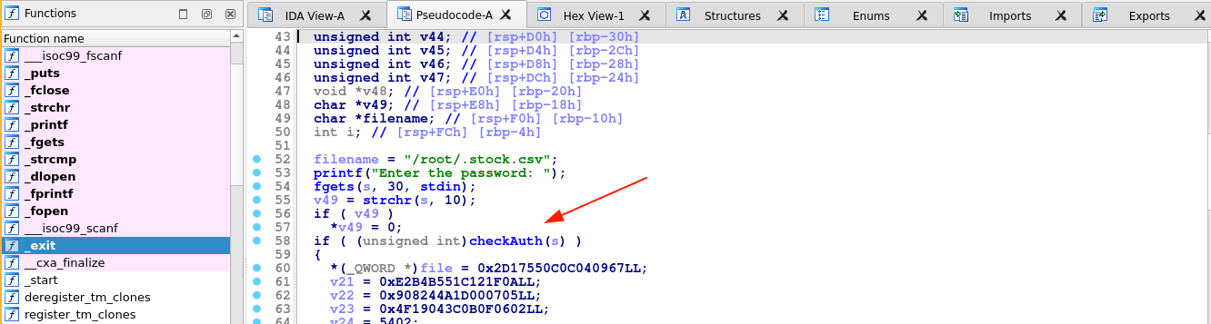The binary is asking for some password, which we do not have. So I downloaded it to my box and opened it in IDA for some analysis. The decompiled main function showed the program reading 30 bytes from standard input and passing it to checkAuth();