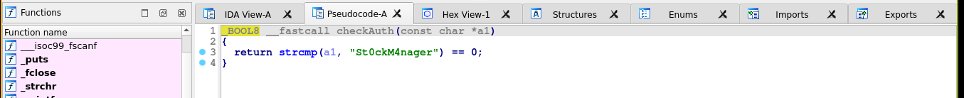 This is likely what’s doing the password check. Looking into it, we can see the correct password in plain text: St0ckM4nager;