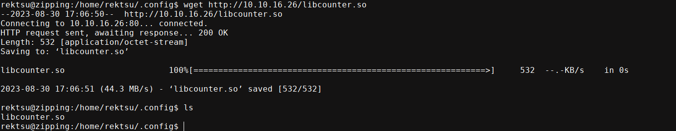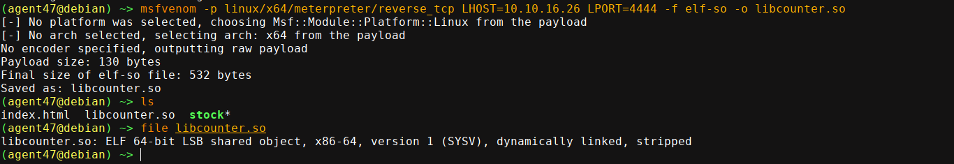 Looks like the binary is loading a .so file in our own home directory, which promises easy privesc. I used msfvenom to generate a .so meterpreter payload;