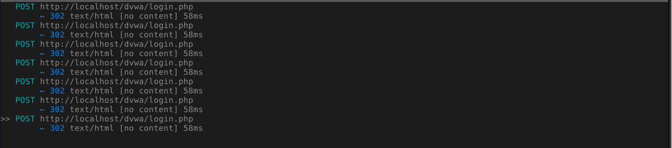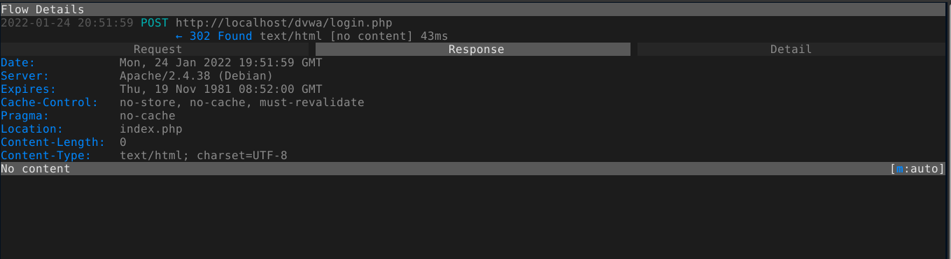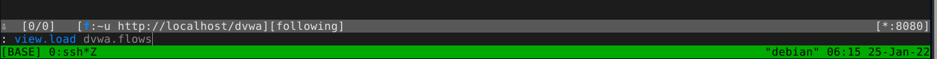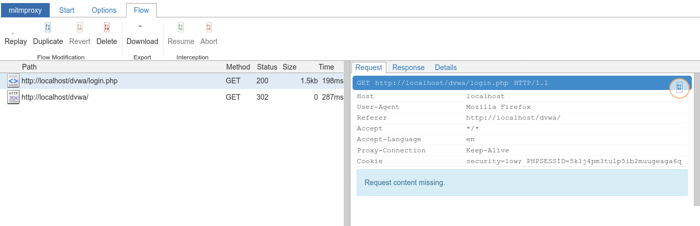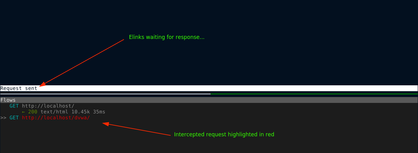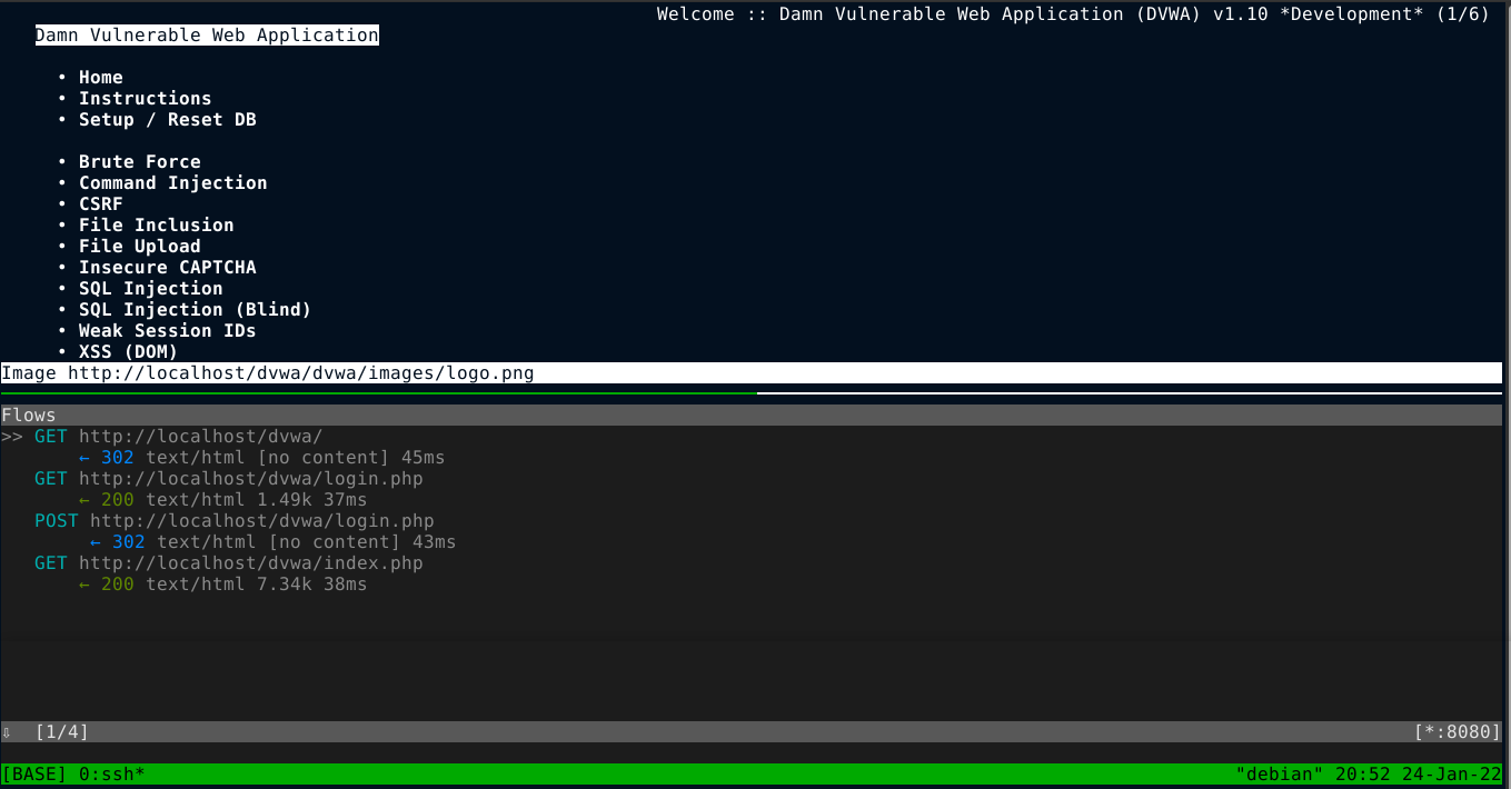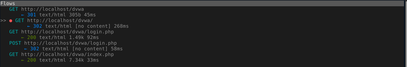 Restarting Elinks and login into DVWA, you can see that all the requests (referred to as flows in MITM proxy) were routed through the proxy;