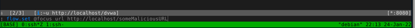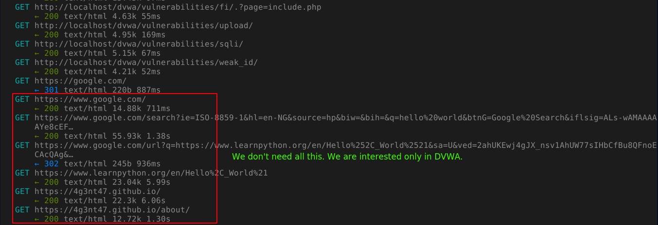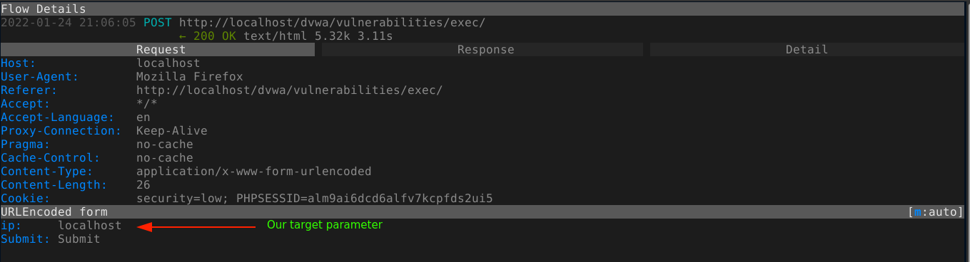 Since we know all URLs for DVWA start with http://localhost/dvwa, we can set up a filter by pressing f, which opens the command prompt of MITM proxy and prefix it with set view filter= (we can manually open the command prompt by typing :), and typing ~u http://localhost/dvwa;