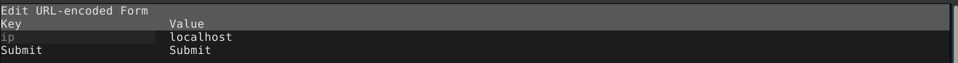 This will open another window containing the name and values of all the form parameters. Move to the field containing localhost (the value we would like to change) and press enter to start the edit;
