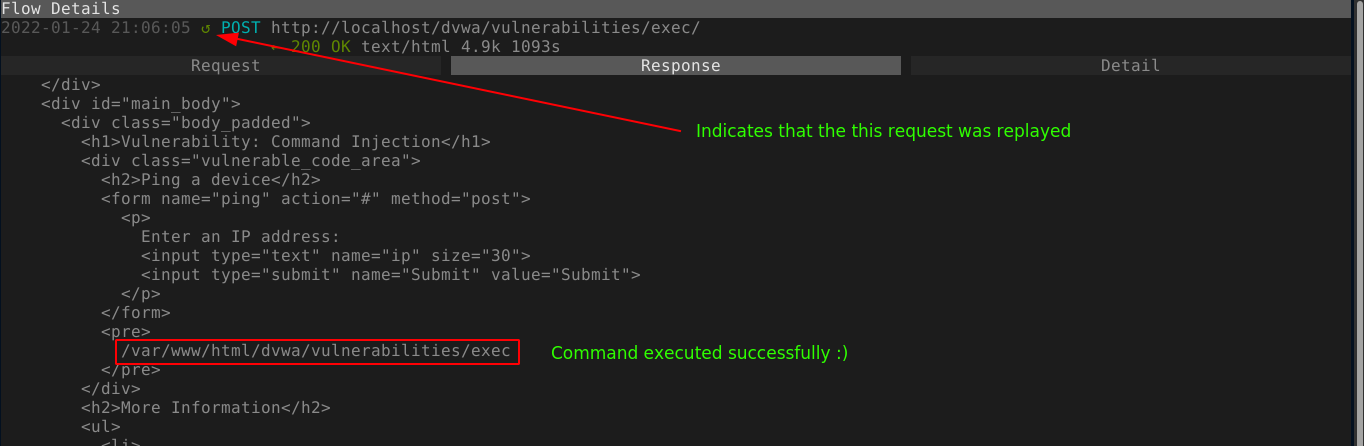 Now we need to send the modified request to the server. To do so, just hit r (replay). A small green circle marker should appear near the URL at the top of the proxy window, which indicate the flow has been replayed. Going to the response tab, we can see that the injected command was executed;