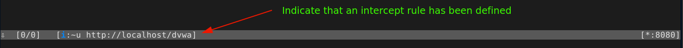 To intercept a request, you will need to define a scope, which is done using similar expressions used in filtering flows showed in the proxy menu. In the main menu, press i, which will open the command prompt and prefix it with set intercept=. In our example, we can intercept all requests made to DVWA by typing ~u http://localhost/dvwa and pressing enter.