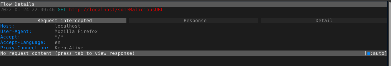 To forward this modified request to the server, press a. This will forward the request to the server and obtain a response. Note that the response is also intercepted, which gives you a chance to inspect or modify it. After you are done, hit a again to forward the response back to the browser. You can also kill an intercepted flow by pressing X in the main menu.