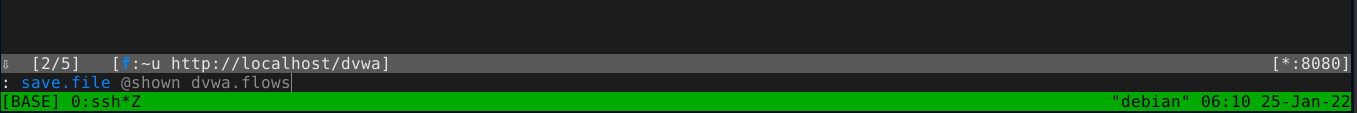 The above will save the flows as dvwa.flows. Alternatively, you can save an individual flow by opening the flow (by clicking on it) and pressing w, which will prompt you for a filename.